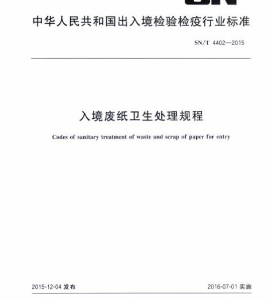 SN/T 4402规定了人境废纸卫生处理的方法、效果判定及处置。