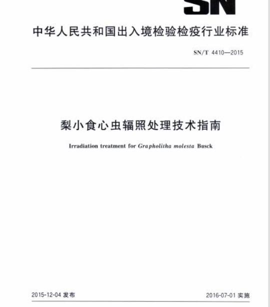 SN/T 4410规定了进境货物中发现梨小食心虫(GrapholithamolestaBusck)实施检疫辐照处理的技术要求,处理目的是阻止梨小食心虫成虫羽化。