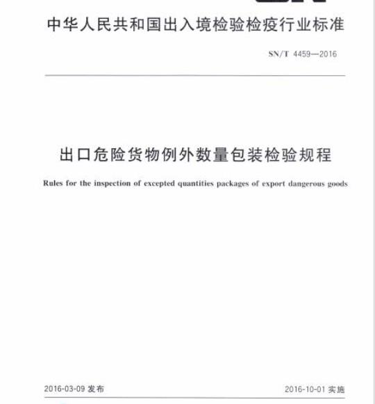 SN/T 4459规定了按联合国《关于危险货物运输的建议书规章范本》以例外数量运输时包装的要求、抽样和检验。