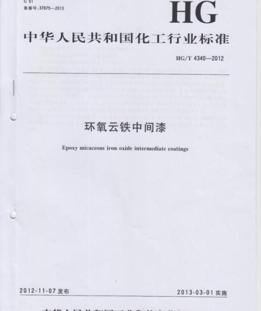 HG/T 4340适用于由环氧树脂为主要成膜物质,加人云母氧化铁颜料等制成的双组分涂料,主要用作防腐涂装体系的中间层。