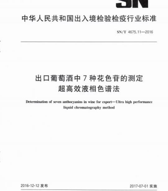 SN/T 4675.11规定了葡萄酒中花翠素-3-O-葡萄糖苷、花青素-3-O-葡萄糖苷、甲基花翠素-3-O-葡萄糖苷、甲基花青素-3-O-葡萄糖苷、二甲花翠素-3-O-葡萄糖苷、花翠素-3,5-O-双葡萄糖苷以及花青素-3,5-O-双葡萄糖苷等7种花色苷的超高效液相色谱测定方法。