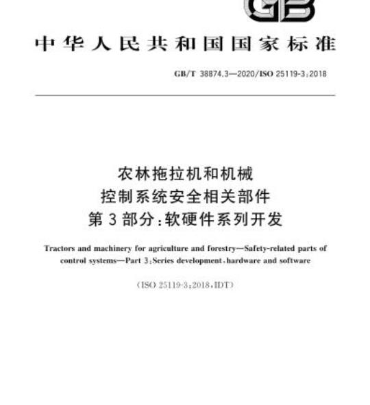 GB/T 38874的本部分规定了控制系统安全相关部件(SRP/CS)软硬件设计与开发通则。GB/T 38874.3适用于农林拖拉机、农用自走式机械、农用全挂及半挂机械、农用牵引机械,也适用于市政机械(例如:道路清扫机)。