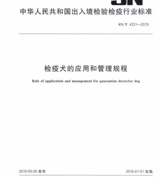 SN/T 4231规定了检验检疫机构对检疫犬应用和管理过程中的工作规程。