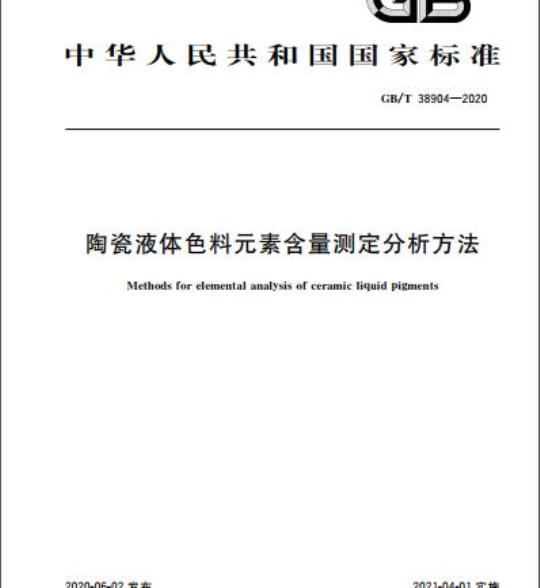 GB/T 38904适用于陶瓷液体色料产品中元素含量的测定。可分析陶瓷液体色料中硅、铝、铁、钙、镁、钾、钠、钛、锂、硼、锌、铅、镨、锆、锰、锡、镉、铬、钴、金、银、锑、硒、铈等元素的含量。