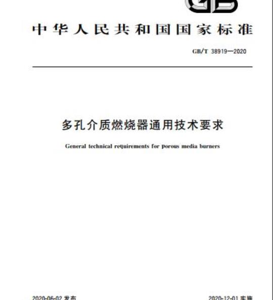 GB/T 38919规定了多孔介质燃烧器的术语和定义、要求、试验方法、检验规则、标志、包装、运输和贮存。