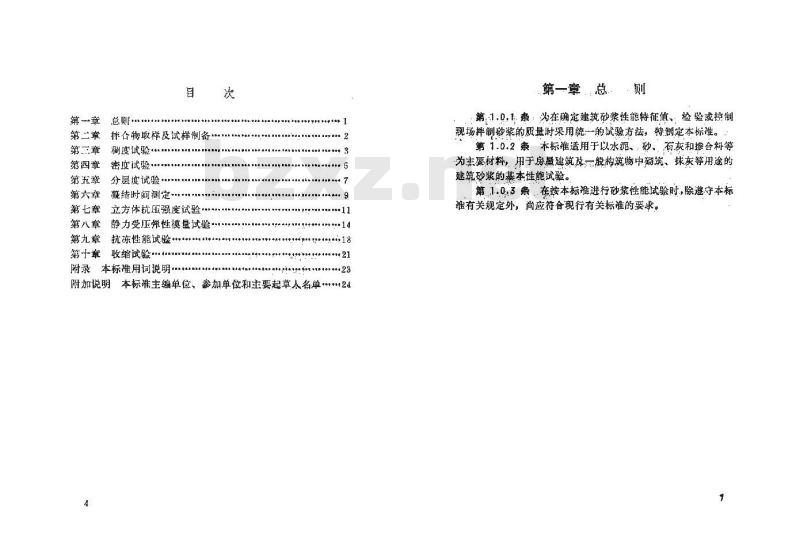 第1.0,1.条:为在确定建筑砂浆性能特征值、,检验或控制现场拌制础浆的殿量时采用统一的试验方法,特制定本标准。第1.0.2条本标准适用于以水泥、:砂,药灰和掺合料等为主要材料,用于房屋建筑一般构筑物中研筑、抹灰等用途的建筑砂浆的基本性能试验。