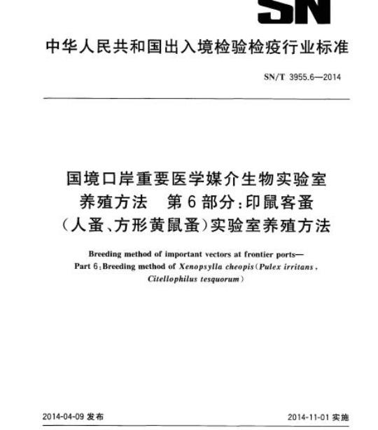 SN/T3955《国境口岸重要医学媒介生物实验室养殖方法》其分为6部分:-第1部分:中华按蚊(嗜人按蚊)实验室养殖方法:第2部分:白纹伊蚊(埃及伊蚊)实验室养殖方法;第3部分:淡色库蚊(致倦库蚊)实室养殖方法:第4部分:家崛(既腐蝇)实验室养殖方法:第5部分:德国小(美洲人嫌、澳洲大螺、褐斑大)实验室养殖方法:第6部分:印鼠客蚤(人蚤、方形黄鼠蚤)实验室养殖方法。本部分为SN/T3955的第6部分。