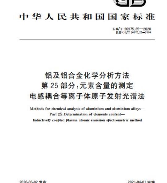 GB/T 20975的本部分规定了电感耦合等离子体原子发射光谱法测定铝及铝合金中硅、铁、铜、镓、镁、锰、铬、镍、锌、钛、银、硼、铋、锂、铅、锡、钒、锆、钡、铍、钙、镉、钴、饵、铪、钢、钾、钠、钼、钕、磷、锑、钪、锶、钨、钇、镱含量。