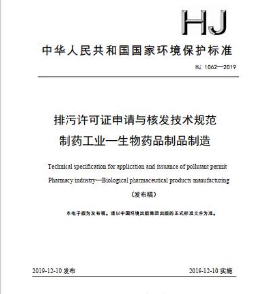 HJ 1062规定了制药工业一生物药品制品制造排污单位排污许可证申请与核发的基本情况填报要求、许可排放限值确定、实际排放量核算和合规判定的方法,以及自行监测、环境管理台账与排污许可证执行报告等环境管理要求,提出了污染防治可行技术要求。