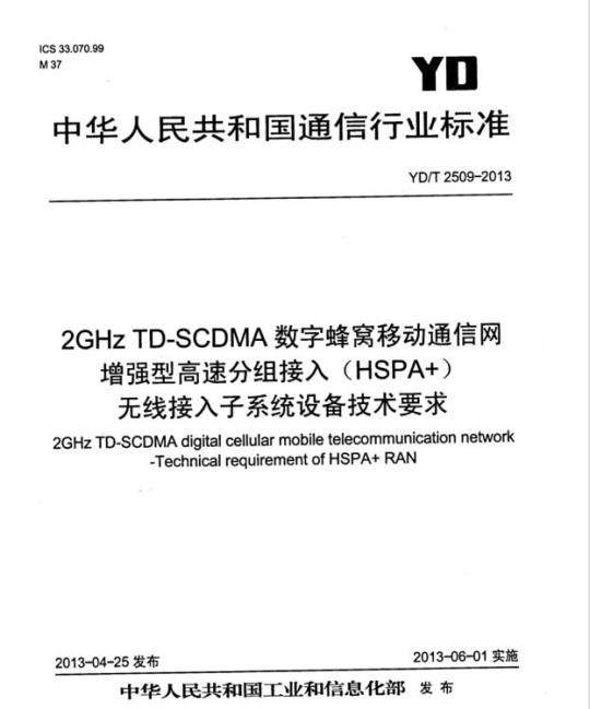 YD/T 2509适用于具有增强型高速分组接入(HSPA+)功能的2GHz TD-SCDMA数字蜂窝移动通信网。