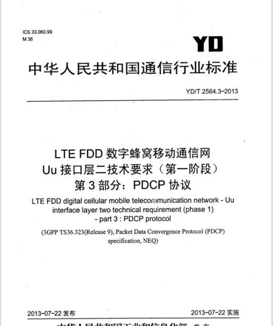 YD/T 2564.3规定了LTE FDD Uu接口的分组数据汇聚协议(PDCP),包括PDCP架构、PDCP过程、 协议数据单元、格式及参数、和变量、常量及定时器。