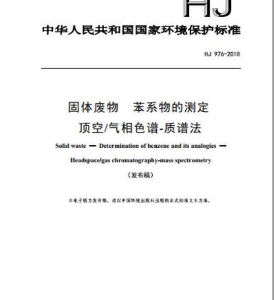 HJ 976-2018.Solid waste一Determination of benzene and its analogies一Headspace/gas chromatography-mass spectrometry.