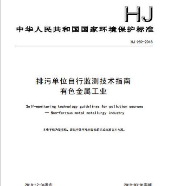 HJ 989提出了有色金属(铝、铅、锌、铜、镍、钴、镁、钛、锡、锑、汞)工业冶炼排污单位自行监测的一般要求、监测方案制定、信息记录和报告的基本内容及要求。