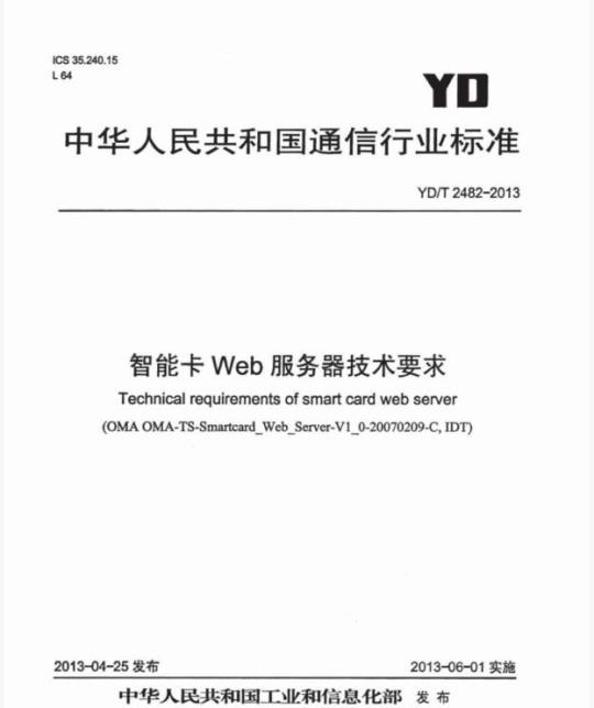 YD/T 2482定义了移动设备中插入的智能卡(例如SIM, (U)SIM, UICC, R-UTM, CSIM)中的HTTP服务器接口(例如智能卡Web服务器),接口包括以下内容:
