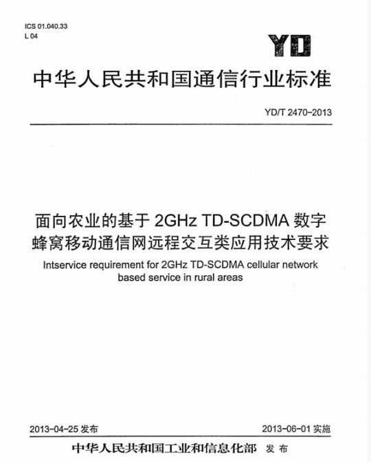 YD/T 2470规定了面向农业的基于2GHz TD-SCDMA数字蜂窝移动通信网远程交互类应用涉及到的业务功能和流程、业务管理要求、计费原则等内容。