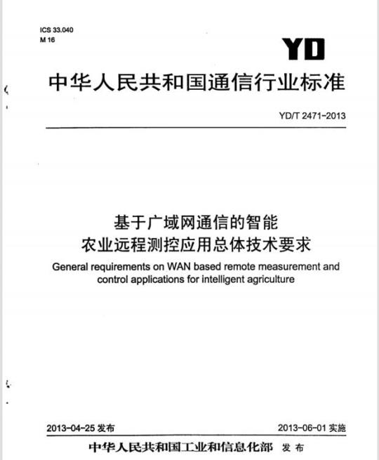 YD/T 2471规定了基于广域网通信的智能农业远程测控应用的业务概述、业务特征、业务范围、业务分类以及业务描述和应用场景描述等方面。