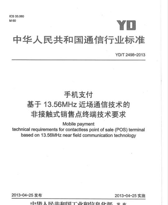 YD/T 2498适用于基于13.56MHz近场通信技术的非接触式销售点终端设备。