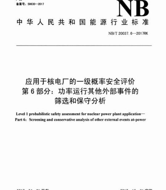 NB/T 20037.6适用于压水堆核电厂除地震、内部水淹、内部火灾外的其他外部事件的筛选和保守分析,低功率和停堆工况及其他堆型的核电厂可参照执行。