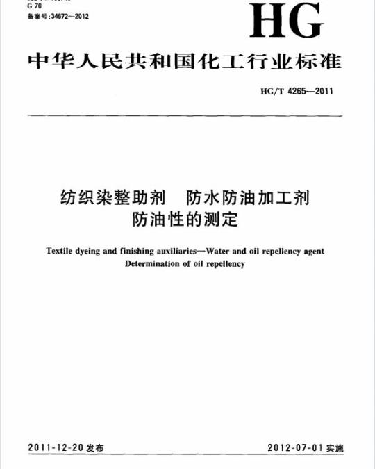 HG/T 4265适用于纺织染整助剂中防水防油加工剂防油性的测试。