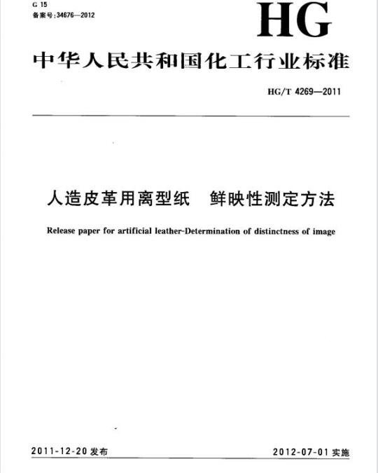 HG/T 4269规定了人造皮革用离型纸(以下简称“离型纸”)鲜映性测定方法。