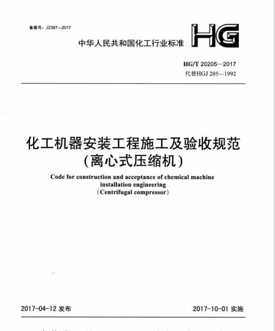 中文名称:代替 HGJ 205-1992 化工机器安装工程施工及验收规范(离心式压缩机)
