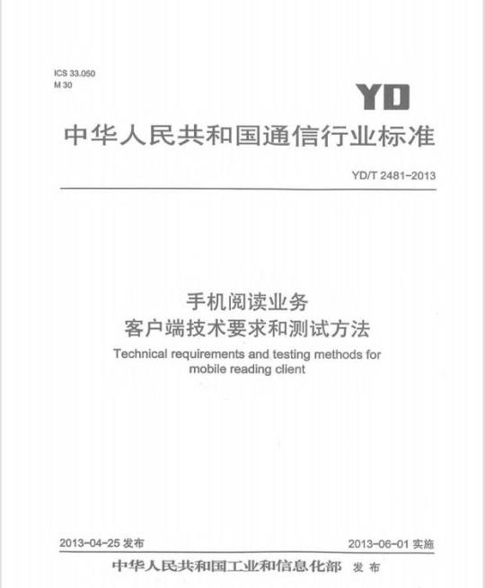 YD/T 2481规定了在移动通信终端上开展移动阅读业务的客户端的总体要求、功能要求、业务要求、性能要求、以及对应的测试方法。