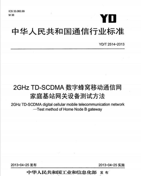 YD/T 2514适用于不支持闭合用户群(CSG)的2GHz TD-SCDMA数字蜂窝移动通信网家庭基站网关设备和安全网关设备。