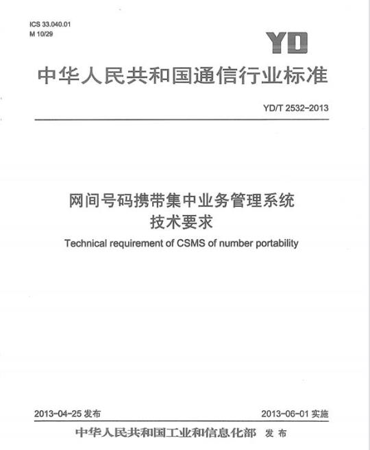 YD/T 2532规定了号码携带集中业务管理系统的组成、功能定位、基本功能要求、接口协议、性能要求、机械结构、环境以及电源要求等。