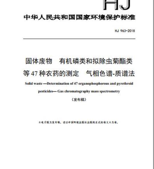 HJ 963规定了测定固体废物及其浸出液中有机磷类、拟除虫菊酯类等47种农药的气相色谱-质谱法。