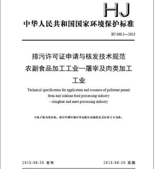 HJ 860.3-2018.Technical specification for application and issuance of pollutant permit farm and sideline food processing industry-slaughter and meat processing industry.
