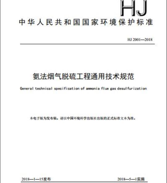 HJ 2001规定了氨法烟气脱硫工程的设计、施工、验收、运行和维护等技术要求。