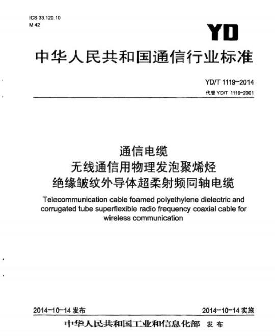 YD/T 1119规定了无线通信用物理发泡聚烯烃绝缘皱纹外导体超柔射频同轴电缆(以下简称电缆)的产品分类、要求、试验方法、检验规则、产品标志、包装、运输和储存等要求。