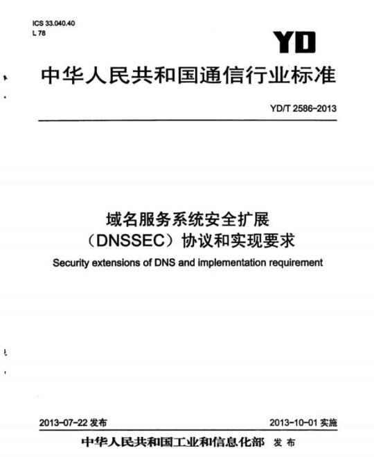 YD/T 2586针对域名服务系统安全扩展的功能、协议和工作原理进行了详细的规定,并提出了DNSSEC部署实施的要求。