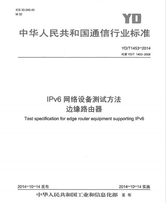 YD/T 1453主要规定了IPv6边缘路由器的电气安全测试、环境测试、接口特性测试、PPP协议测试、TCP/IP协议(IPv6、邻居发现、ICMPv6、 MLD等)测试、路由协议(RIPng、 OSPFv3、 ISISv6、BGP4+) 测试、组播路由协议(PIM-SM)测试、网络管理功能测试、安全功能测试、性能测试等。