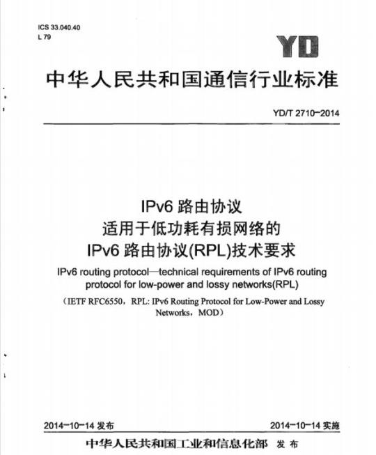 YD/T 2710-2014 IPv6.IPv6 routing protocol- technical requirements of IPv6 routing protocol for low-power and lossy networks(RPL).
