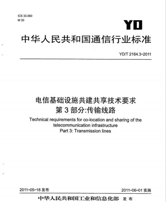 YD/T 2164.3规定了电信基础设施传输线路共建共享技术要求,包括共建共享原则、条件及技术要求。