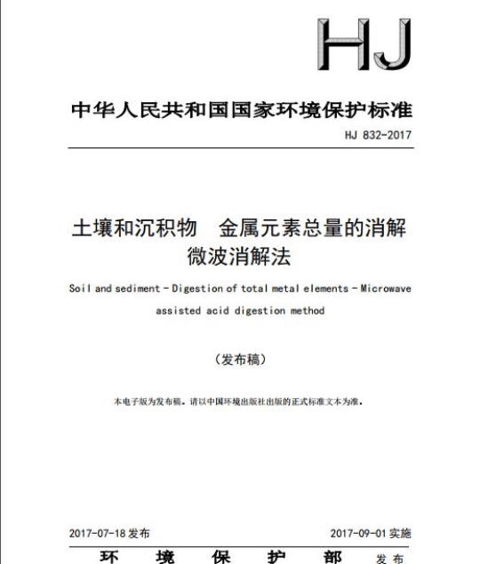 HJ 832规定了土壤和沉积物中金属元素总量的微波消解法。