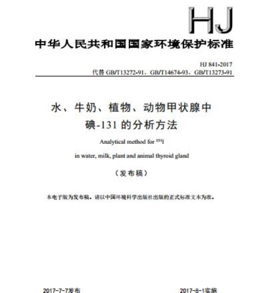 HJ 841规定了水、牛奶、植物、动物甲状腺中碘-131的分析方法。