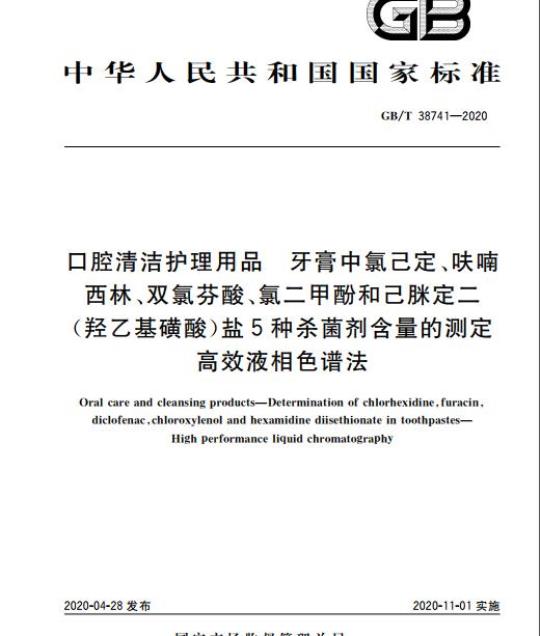 GB/T 38741适用于牙膏中氯己定、呋喃西林、双氯芬酸、氯二甲酚和己脒定二(羟乙基磺酸)盐含量的测定。