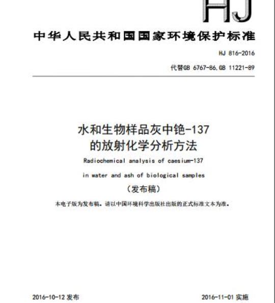 HJ 816规定了测定水和生物样品灰中铯- 137的放射化学分析方法。
