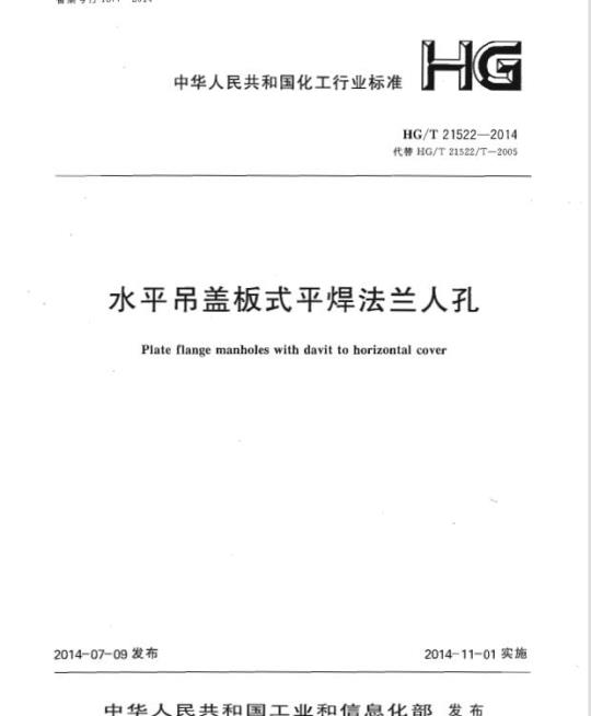 本标准自实施之日起代替《水平吊盖板式平焊法兰人孔》HG/T21522一2005。本标难在修订过程中,标难编制组经广泛的调查研究,认真总结实践经验,结合相关标准的变化,并在广泛征求意见的基础上,修订本标准,最后经审查定稿。本标推与HG/T21522一2005相比,主要变化如下:1.将所有被引用的过时标准全部蔓新为最新版本。2.将公称压力PN 的表达形式进行调整,与《钢制管法兰、垫片、紧固件》HG/T 20592~~20635—2009保持·-致。