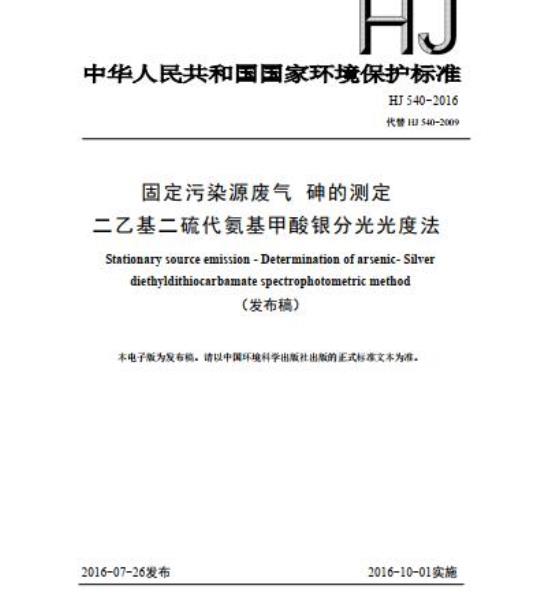 HJ 540规定了测定固定污染源废气中以颗粒物形态存在的砷及其化合物的二乙基二硫代氨基甲酸银分光光度法。
