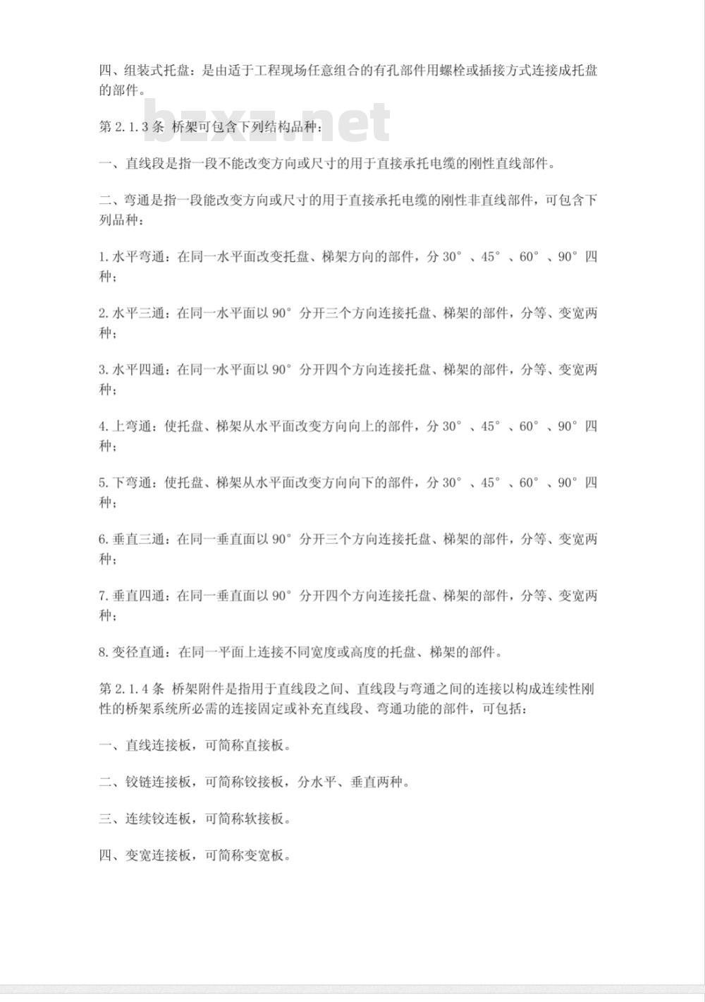 第2.1.3条桥架可包含下列结构品种:一、直线段是指一段不能改变方向或尺寸的用于直接承托电缆的刚性直线部件。二、弯通是指一段能改变方向或尺寸的用于直接承托电缆的刚性非直线部件,可包含下列品种: