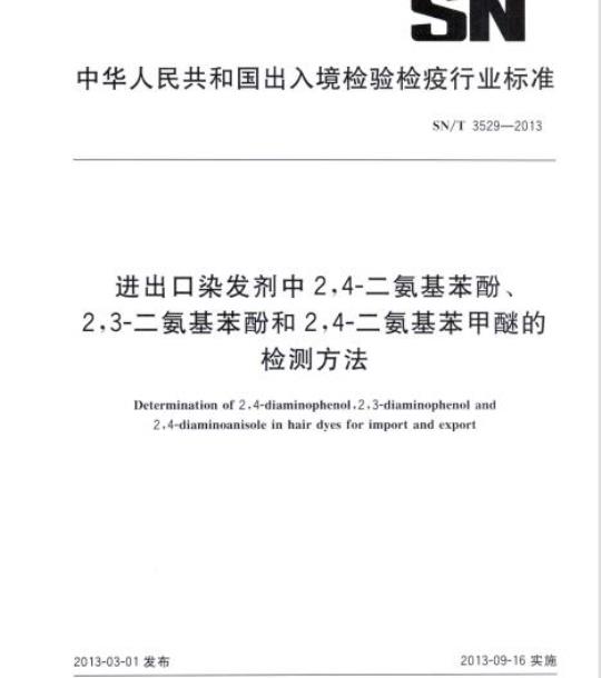SN/T 3529规定了氧化型染发剂中2,4-二氨基苯酚、2,3-二氨基苯酚的液相色谱测定方法和2,4-二氨基苯酚、2,3-二氨基苯酚.2,4-二氨基苯甲醚的液相色谱质谱/质谱测定方法。