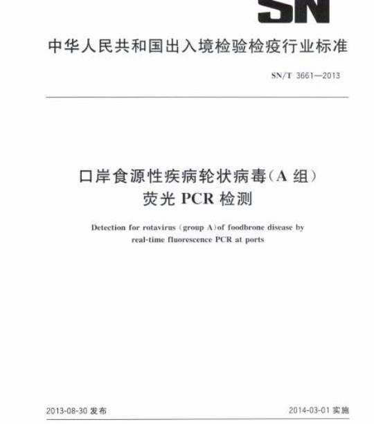 SN/T 3661规定了国境口岸食源性轮状病毒(A组)的荧光PCR快速检测方法,包括标本采集、运输与保存、处理、核酸提取与检测、结果分析以及相应的生物安全措施。