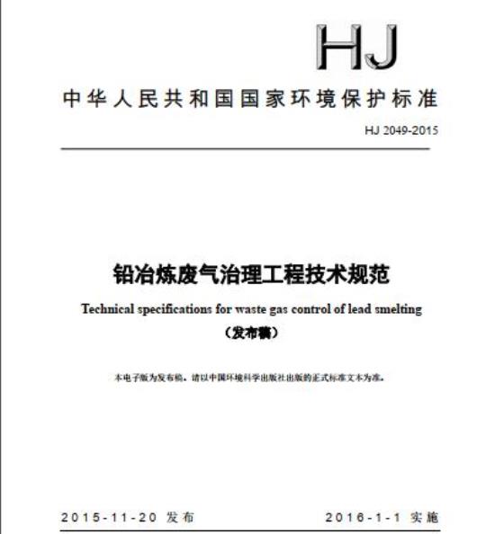 HJ 2049规定了铅冶炼废气治理工程的设计、施工、验收、运行和维护等技术要求。