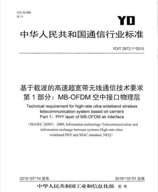 YD/T 2873.1适用于公用电信网环境下基于载波的采用MB-OFDM技术的超宽带通信系统,专用电信网也可参照使用。