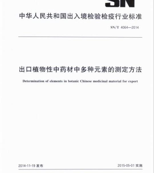 SN/T 4064规定了出口植物性中药材中铅(Pb)、砷(As)、汞(Hg)、镉(Cd)、铜(Cu)、铬(Cr)、硒(Se)、镍(Ni)、锡(Sn)、锌(Zn)、锰(Mn)、铁(Fe)等十二种元素(以下简称12种元素)含量的电感耦合等离子体质谱法(ICP-MS)和电感耦合等离子体发射光谱法(ICP- AES)测定方法。