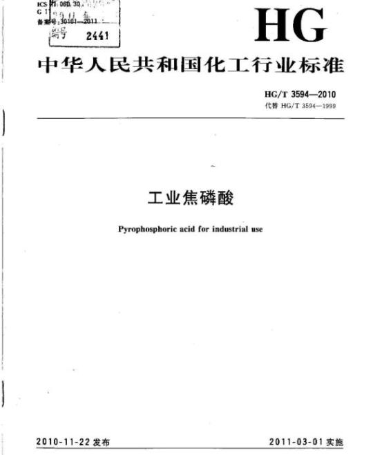 HG/T 3594适用于工业焦磷酸。该产品主要用于电镀工业,用来调节电镀溶液的pH值,作催化剂,还用于制有机磷酸酯。