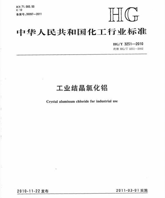 HG/T 3251-2010.Crystal aluminum chloride for industrial use.